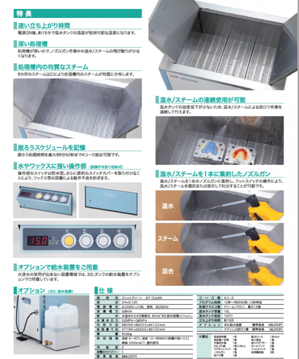 | 商品概要 | ・速い立ち上がり時間 ・温水/スチームの連続使用が可能 ・深い処理槽 ・処理槽内の均質なスチーム ・脱ろうスケジュールを記憶 ・温水/スチームを1本に集約したノスルガン ・水やワックスに強い操作部 ・オプションで給水装置をご用意 販売名 ジェットクリーン JET CLEAN 型式 DH-JC120 電源電圧 AC200V±10% 単相 50/60Hz 消費電力 3.9kVA 給水 水道水からの自動給水または「30L給水装置(オプション)」 水道水圧力 0.2MPa~0.6MPa 外形寸法 590(W)×950(H)×441(D)mm 処理槽寸法 477(W)×225(H)×357(D)mm 質量 52.5kg 使用環境 温度5~40℃、湿度10~95%RH(結露の無いこと)標高2000m以下、屋内使用 汚染度 2 過電圧カテゴリーⅡ コース数 4コース プログラム時間 10秒~99分50秒、10秒単位 処理フラスコ数 ドリームフラスコ 最大12個 温水タンク容量 10L 温水タンク温度 120℃ 立ち上がり時間 約15分 オプション 30L給水装置 付属品 取扱説明書 1冊 保証書/封筒 1組 作業用手袋 1双 20Lゴミ袋 1個(10枚入) マグネットフック 1個 ノズルガン 1個 排ろう槽 1個 給水ホース 1本(5m) 蛇口部品 1個 蛇口アダプター 1個 ホースバンド 2個 フットスイッチ 1個 処理槽底板 3個 |